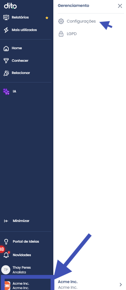 - Acesse: app.dito.com.br e clique em Configurações no Menu Lateral