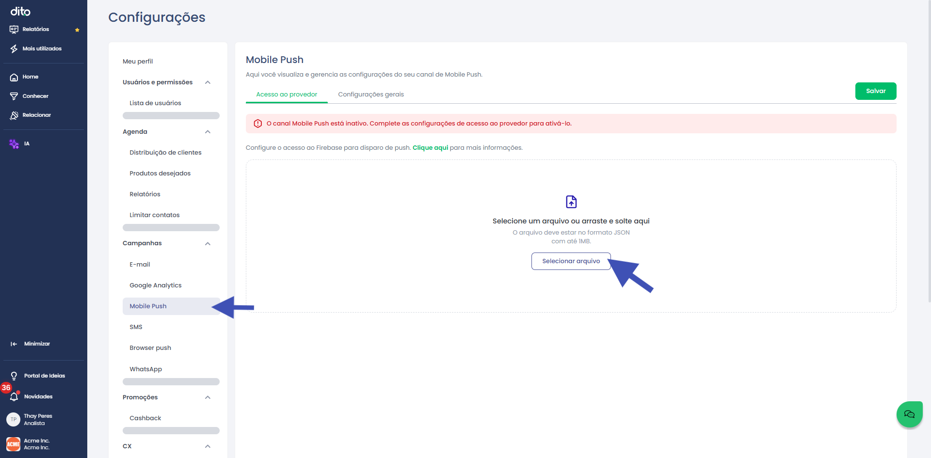 Para configurar seu mobile push e impactar ainda mais seus usuários, você precisará acessar o ambiente do app.dito para inserir o JSON gerado no Firebase.