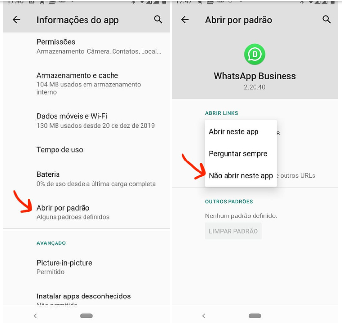 4. Volte em “Aplicativos e notificações”, selecione o WhatsApp que deseja usar, acesse “Abrir por padrão” e escolha “Abrir neste app”.