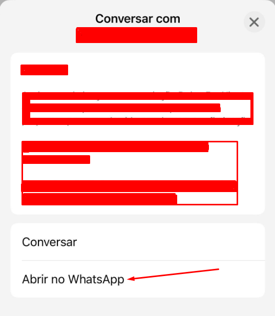 No exemplo acima, ao clicar no botão “Conversar”, o sistema abrirá automaticamente o WhatsApp Business. Caso você queira enviar a mensagem pelo outro WhatsApp, basta clicar em “Abrir no WhatsApp” para escolher o outro aplicativo.