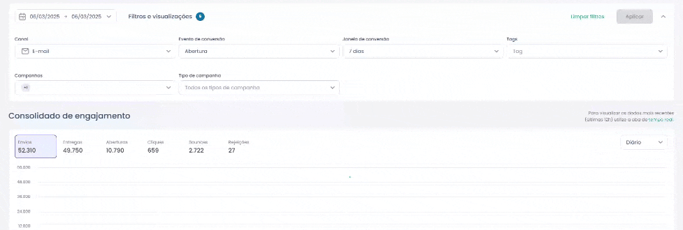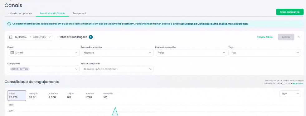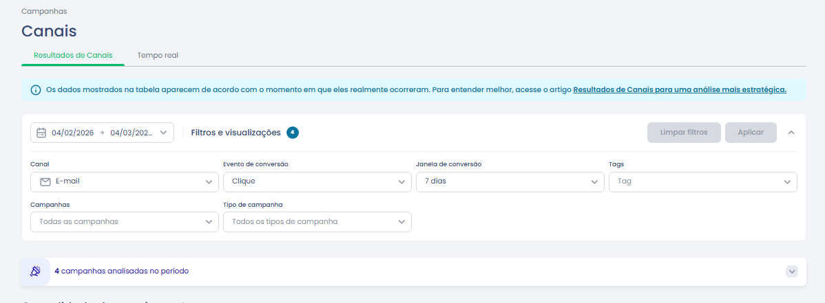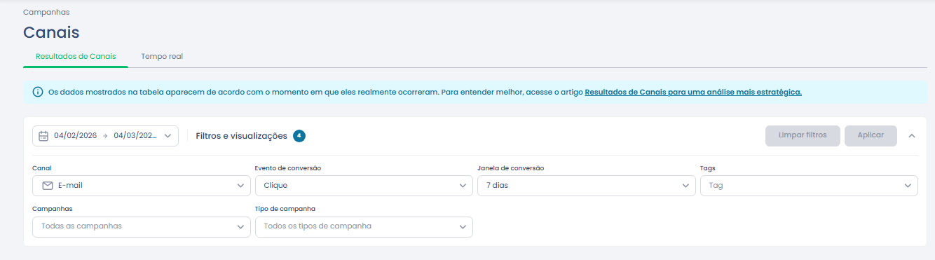 2. Configure os filtros desejados (data, canal, campanhas, etc.).
