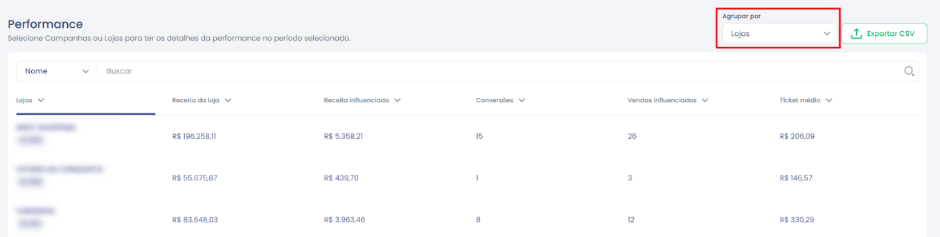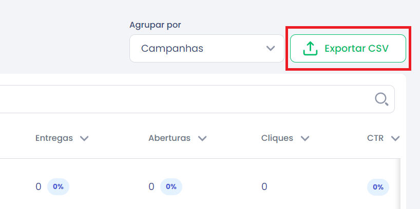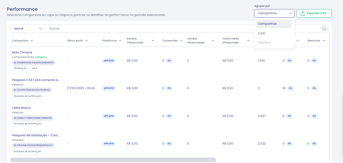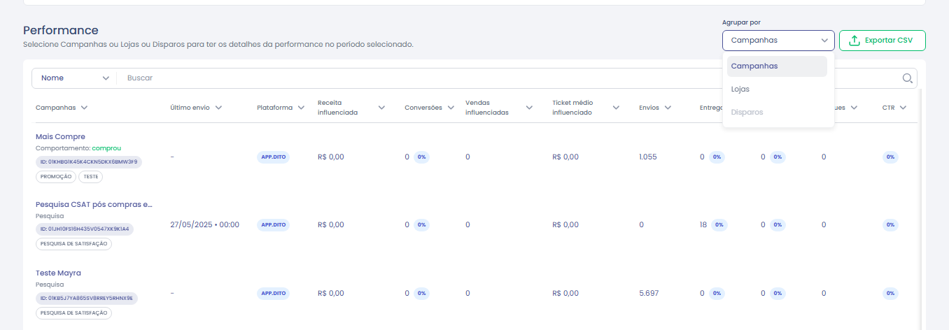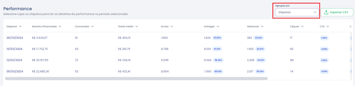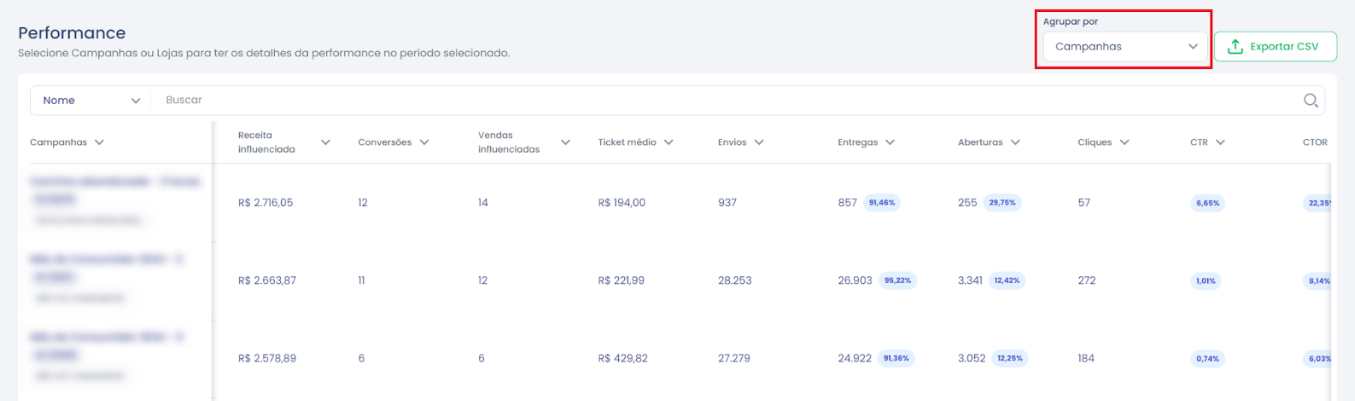 4.Selecione o tipo de agrupamento na tabela (Campanhas, Lojas ou Disparo) e exporte os dados, se necessário.