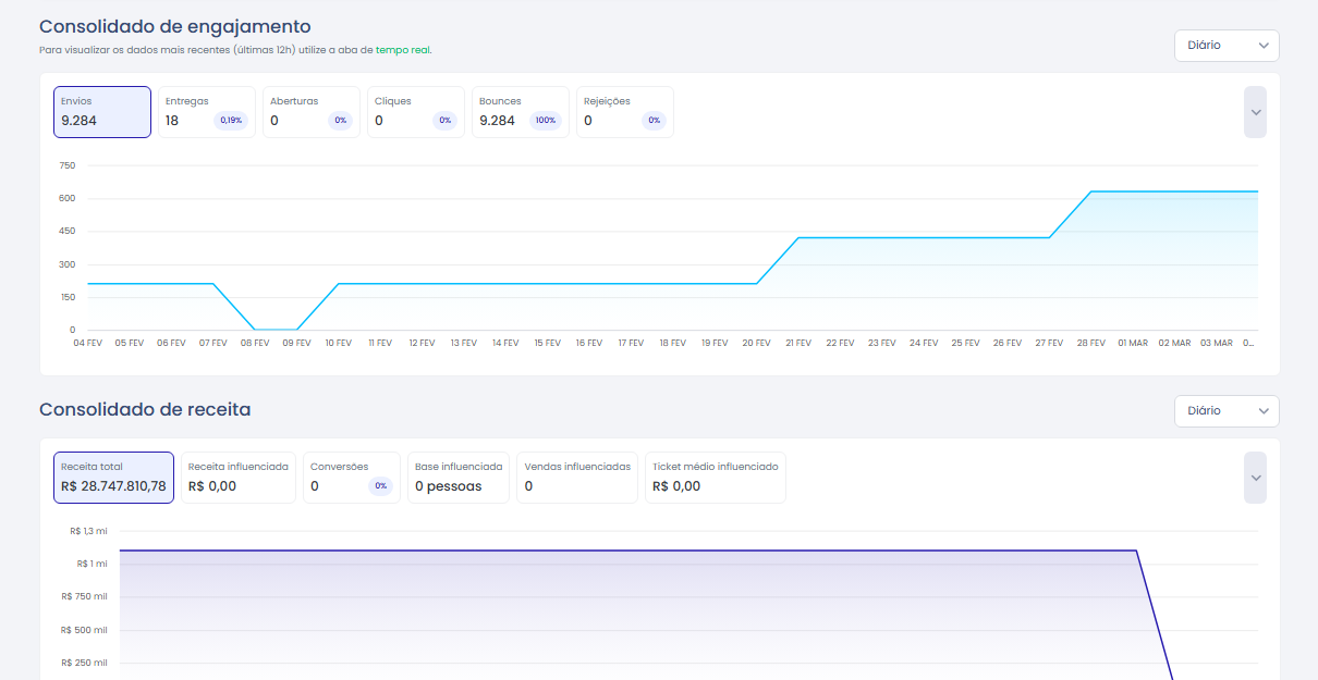 Detalha métricas como envios, aberturas, cliques, conversões e faturamento.