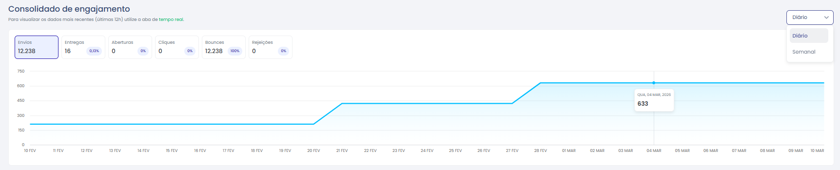 Métricas de engajamento: envios, entregas, aberturas, cliques, CTR, CTOR, bounces, rejeições.