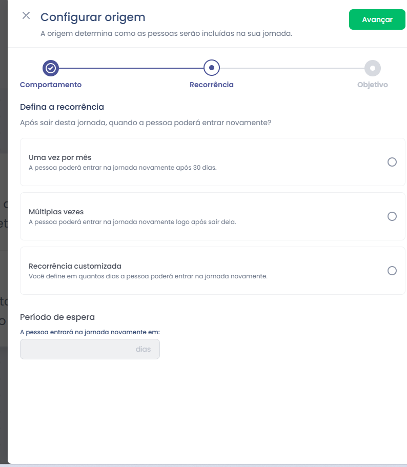 3. Recorrência Customizada: Nesta opção, você quem definirá em quantos dias a pessoa poderá entrar na jornada novamente.