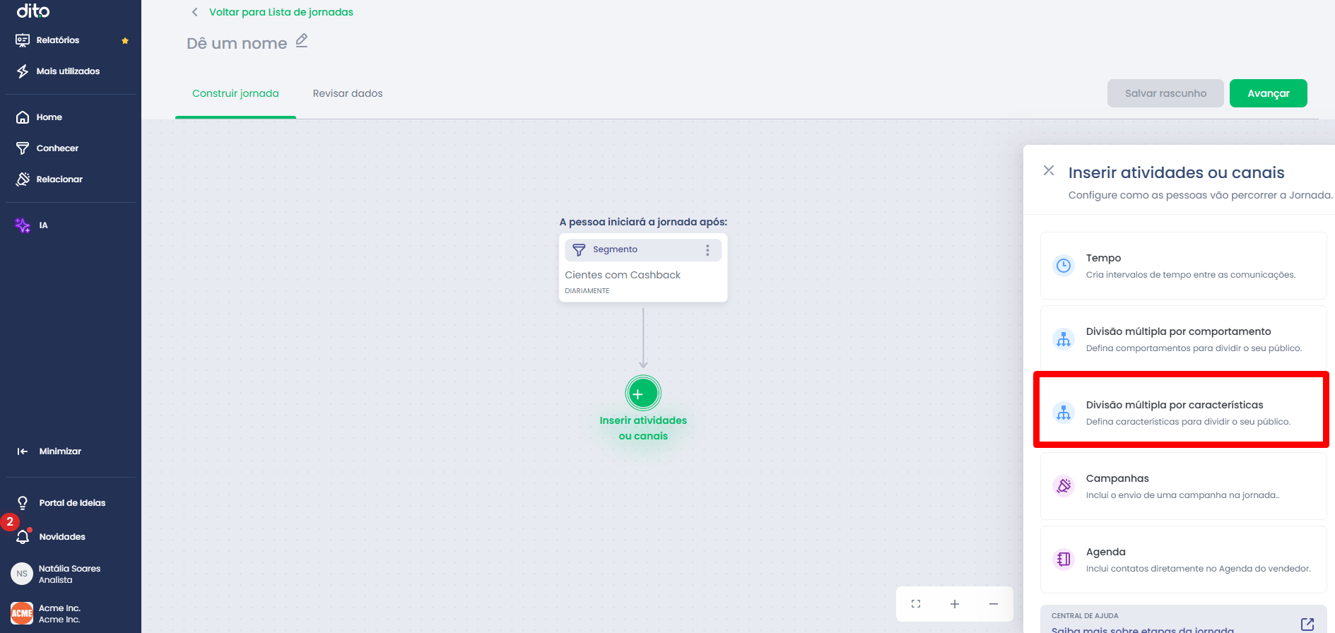 - Divisão múltipla por características: Neste tipo de divisão, os ramos serão características do usuário, não eventos praticados por ele. O tempo de verificação é imediato, a Dito irá olhar se as características estão presentes na ficha do usuário, e já serão direcionados ao caminho especificado. Para saber mais detalhes sobre esse tipo de divisão, clique aqui.