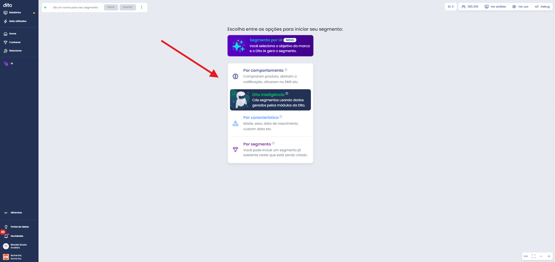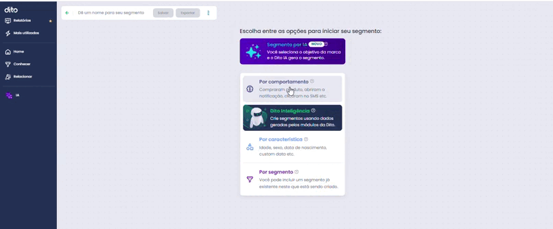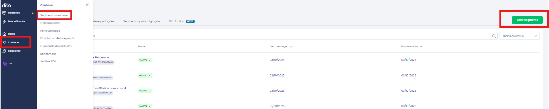 No menu lateral do App.Dito, acesse a aba "CONHECER" e depois clique em "SEGMENTOS REALTIME", após isso basta ir na opção "CRIAR SEGMENTO":