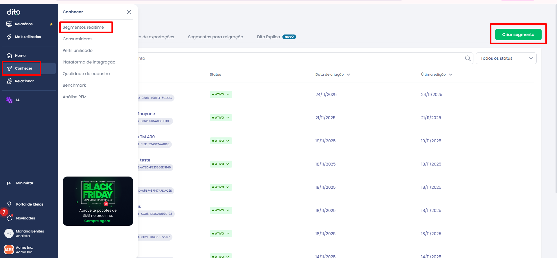 Acesse o menu em: Conhecer > Segmentos > Criar segmento