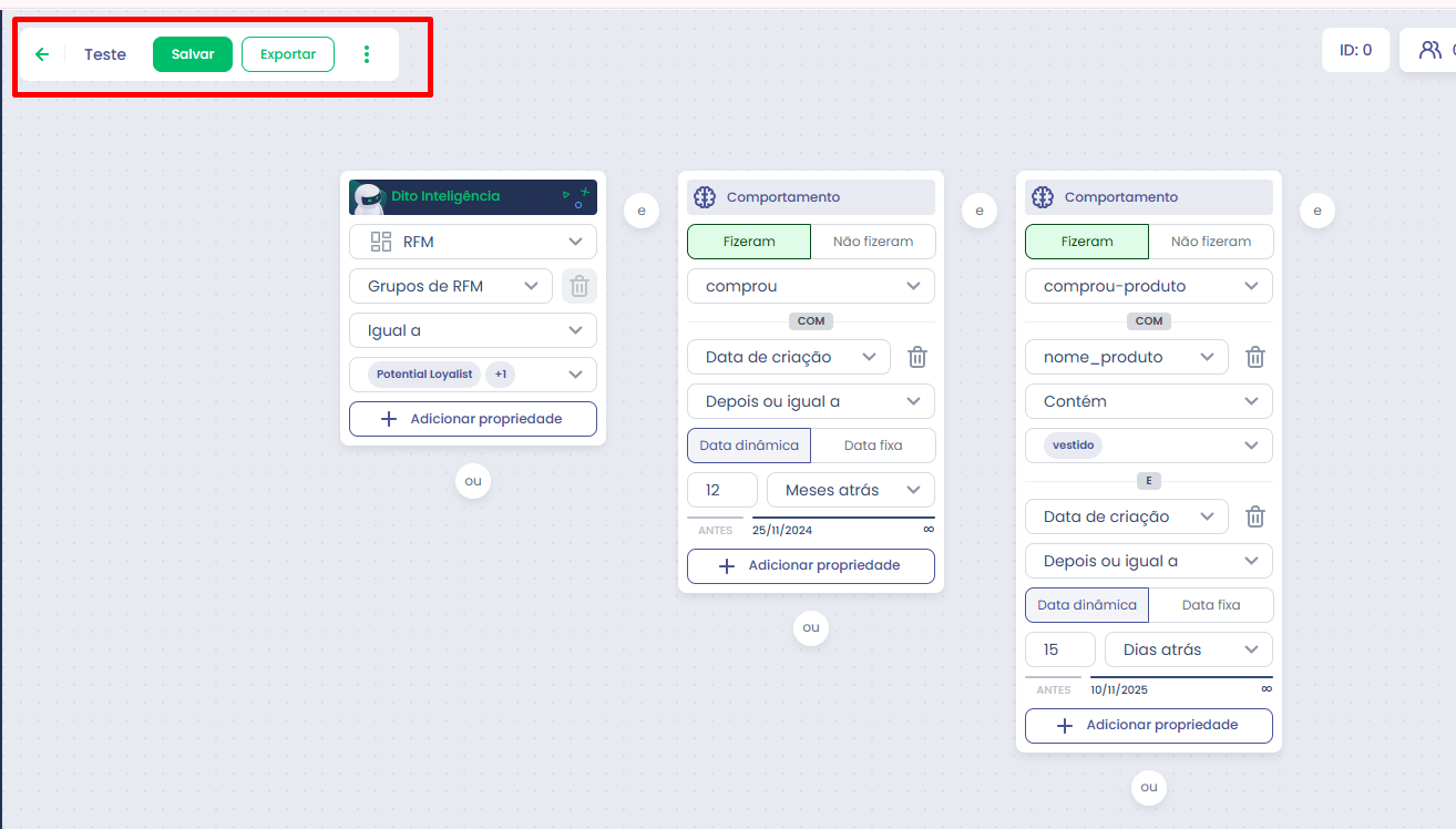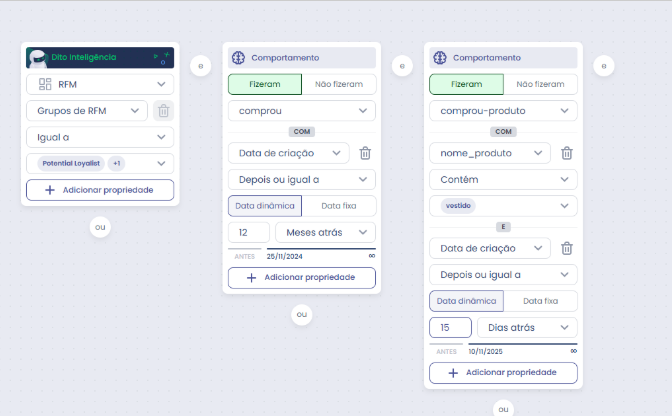 A funcionalidade permite cruzar informações de RFM com o comportamento de compra dos clientes, possibilitando criar segmentações avançadas com base no grupo RFM atual e nos produtos já comprados.