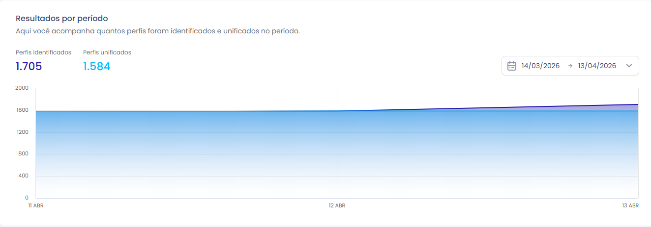 No gráfico de resultados por período, apresentamos a evolução diária dessas identificações e unificações. Ele vai mostrar se a velocidade de unificação de uma marca está satisfatória ou se a mesma precisa dedicar um pouco mais de tempo no módulo para resolver as pendências.