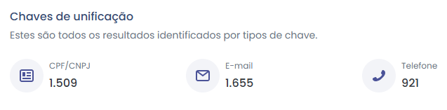 As chaves de unificação são os critérios que o Perfil Unificado utiliza para encontrar uma oportunidade de unificação. Na tela de Visão geral, apresentamos de forma simples quais e quantas são as chaves encontradas na base da marca para que se possa identificar rapidamente se alguma delas está mais baixa que as outras e, com isso, solicitar que seus colaboradores deem mais atenção.