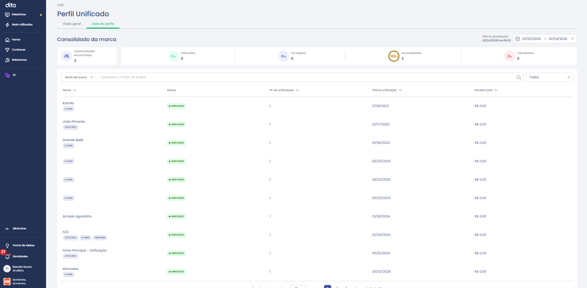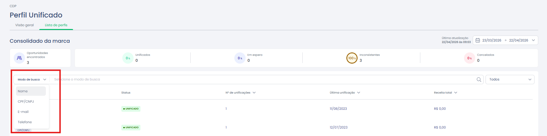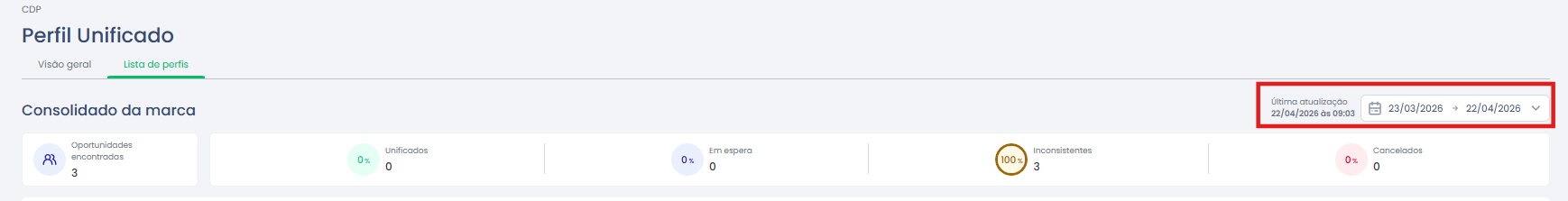 Na aba Lista de perfis, é possível analisar detalhadamente cada informação de duplicidade identificada, unificações e inconsistências.