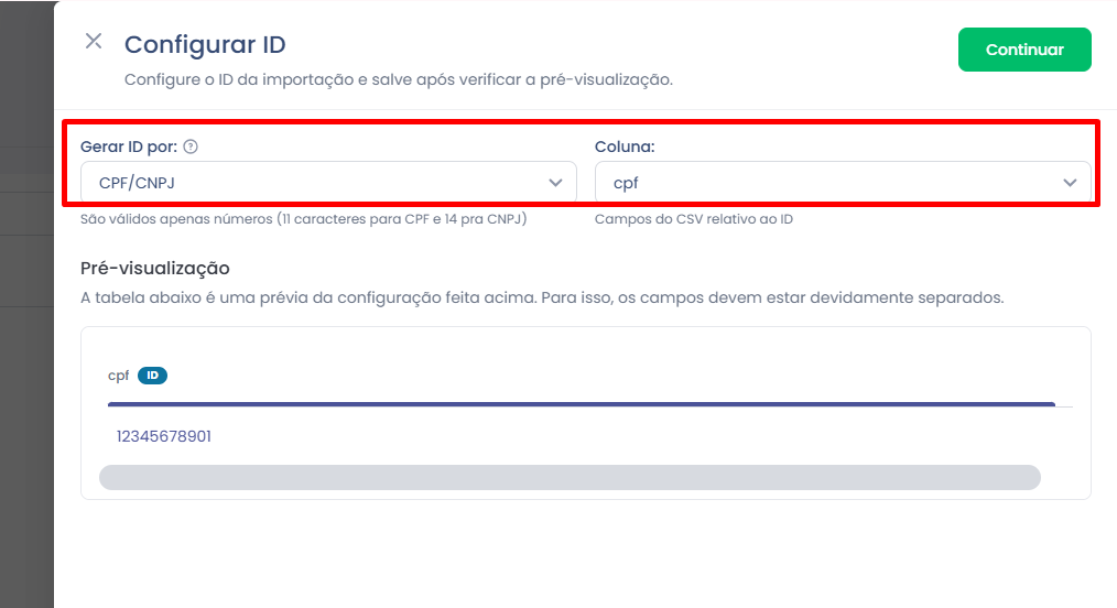 Após carregar o arquivo, configure corretamente os campos e selecione o ID do cliente.