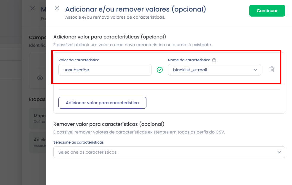 Passo 5 – Adicionar valores de características (opcional, mas necessário no descadastro)