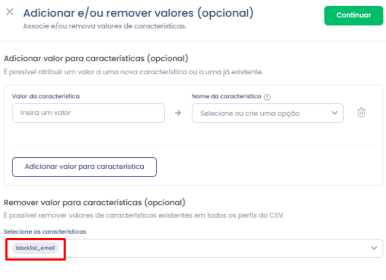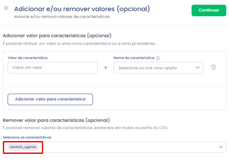 No campo "Remover valor para características", selecione conforme o tipo de recadastro desejado:
