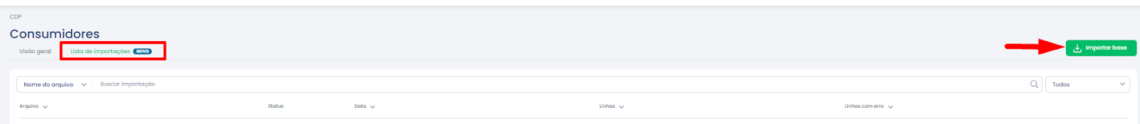 Depois, clique na aba Lista de importações e clique no botão importação de base:
