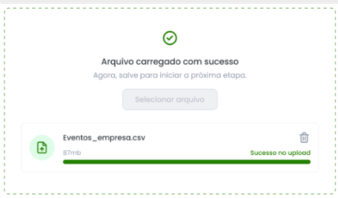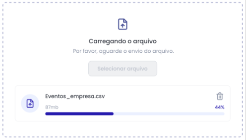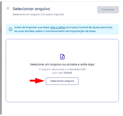 Selecione um arquivo de acordo com o formato padrão:300mb e CSV. Para inserir o arquivo, é possível arrastar o arquivo ou selecionar clicando no botão "Selecionar arquivo".