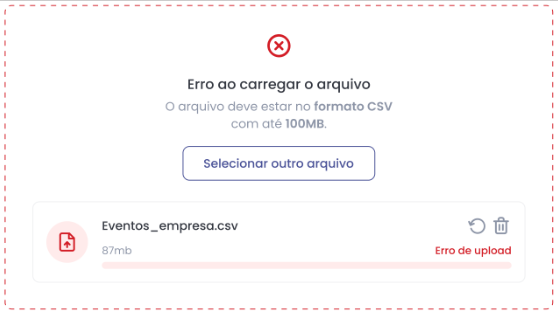 Ou vermelho indicando Erro no upload. No caso de erro, o usuário tem a opção de tentar novamente ou apagar o arquivo. O usuário pode clicar no botão ”Selecionar outro arquivo” para escolher outro, ou arrastar novamente.