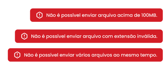 Durante a verificação automática e carregamento do arquivo, podem ser identificadas algumas inconsistências no envio, como por exemplo: arquivo maior que 300MB, extensão inválida ou tentativa de enviar mais de um arquivo ao mesmo tempo. Quando isso acontecer, o sistema exibirá um alerta em vermelho na tela para sinalizar o problema conforme imagens a seguir.