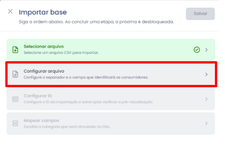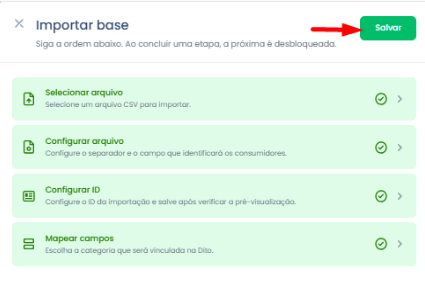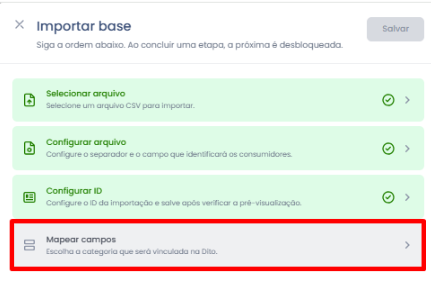 Após completar as quatro etapas de configuração da base importada na Dito, o botão salvar ficará disponível. Antes de clicar nele, ainda é possível clicar em uma das fases e editar algum dado.