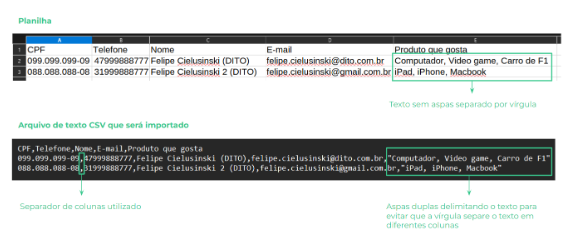 Exemplo: uso do separador de colunas e do delimitador de texto.