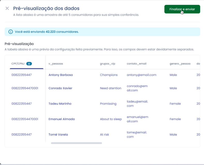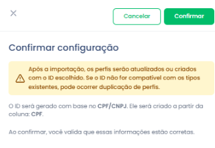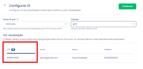 3.Pergunta: Posso importar um arquivo que mistura CPF e e-mail como IDs na mesma coluna? Resposta: Não. A coluna definida como ID deve ter um formato único e consistente. Se você escolher CPF, todas as linhas devem conter apenas CPFs válidos. Se houver dados de e-mail na mesma coluna, o sistema não conseguirá processar a importação corretamente.
