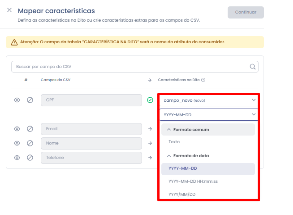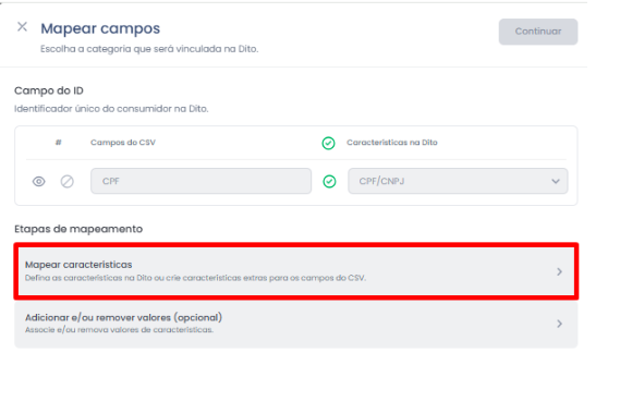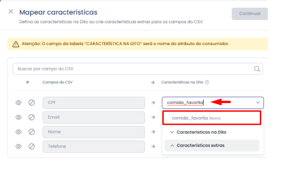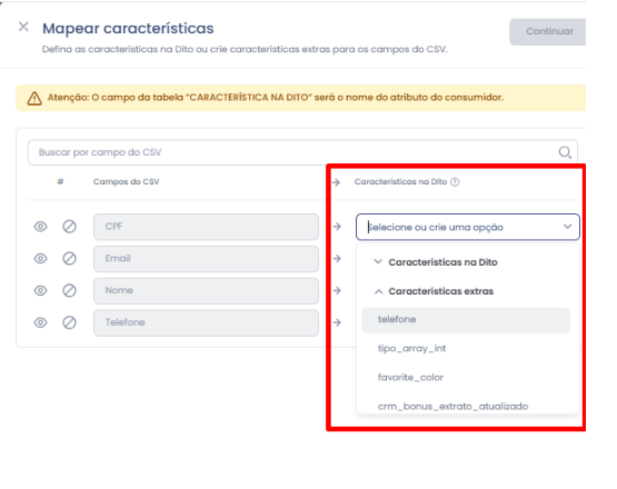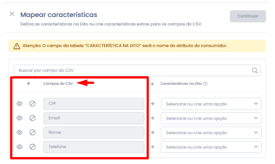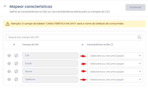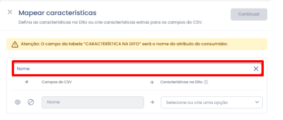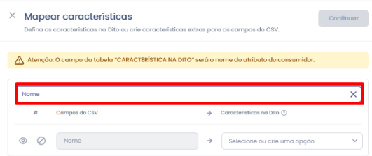 Você irá associar cada coluna do seu arquivo a uma característica correspondente na Dito.