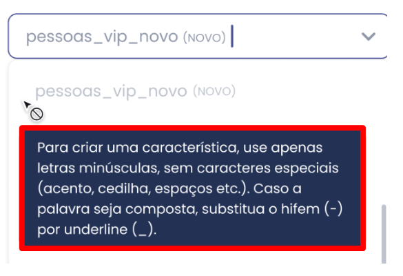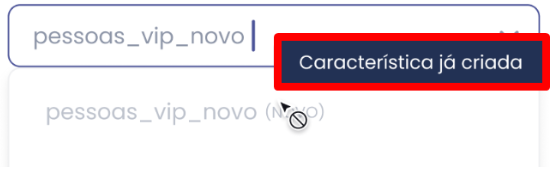 Caso o usuário tente criar uma nova característica repetida (já existente anteriormente ou criada recentemente), o nome ficará no modo "bloqueado" com uma caixa de aviso: