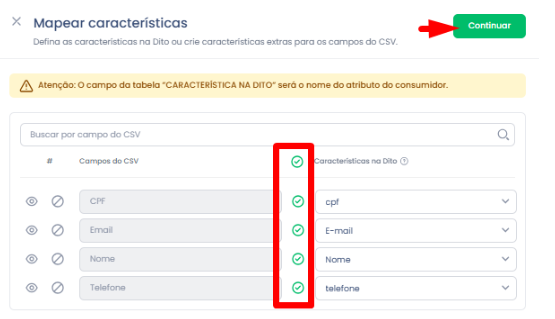 Após concluir a associação de todos os campos, os ícones centrais ficarão verdes, indicando que cada campo foi mapeado corretamente. Nesse momento, o botão “Continuar” será habilitado para que você prossiga com a importação.