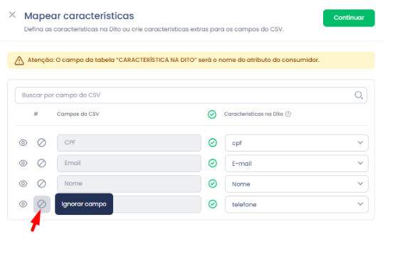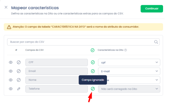 No mapeamento de características, é possível ignorar campos específicos, mas não é permitido ignorar todos - pelo menos um deles precisa ser associado. Quando o usuário clica no ícone “Ignorar”, o campo correspondente fica desabilitado.