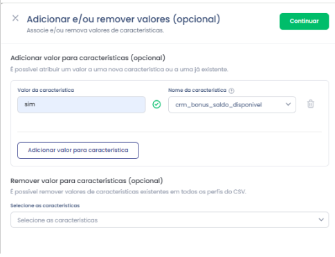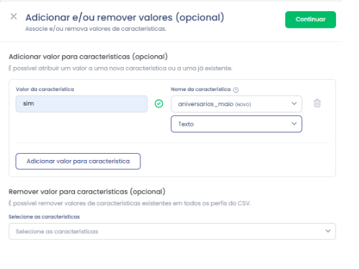 Mostra como atribuir um valor fixo a uma nova ou a uma característica já existente, o que facilita a segmentação e identificação de grupos de consumidores na base importada. - Como Remover valor de características: