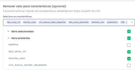 O usuário também tem a opção de “Remover valores de características (opcional)”. Para isso, basta clicar no Multiselect e escolher, entre as características já existentes na Dito, quais terão seus valores apagados.