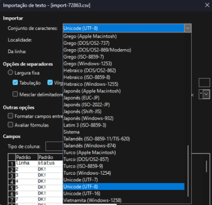 Observação: Encoding do arquivo (Conjunto de caracteres) São suportados: