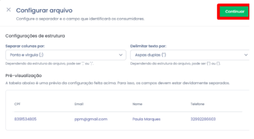 Nessa etapa, será necessário configurar o separador e o campo que identificará os consumidores.