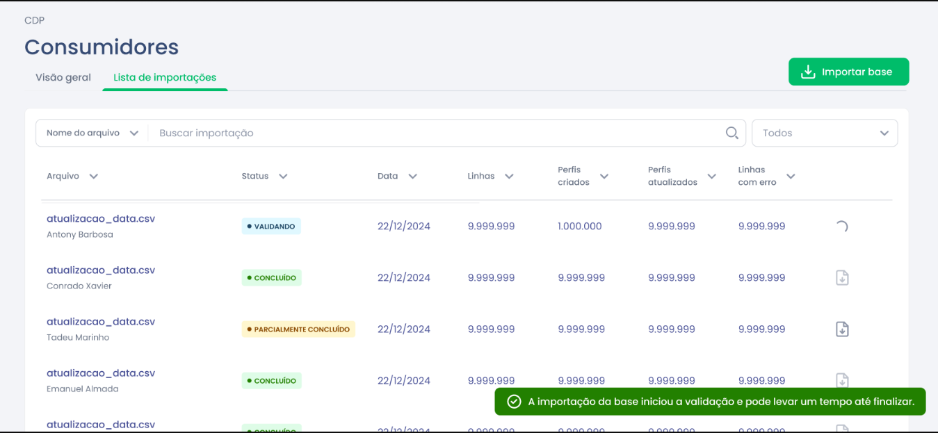 Após finalizar o envio da base, abrirá uma página com a lista de todas as importações já realizadas na marca e seus respectivos status.