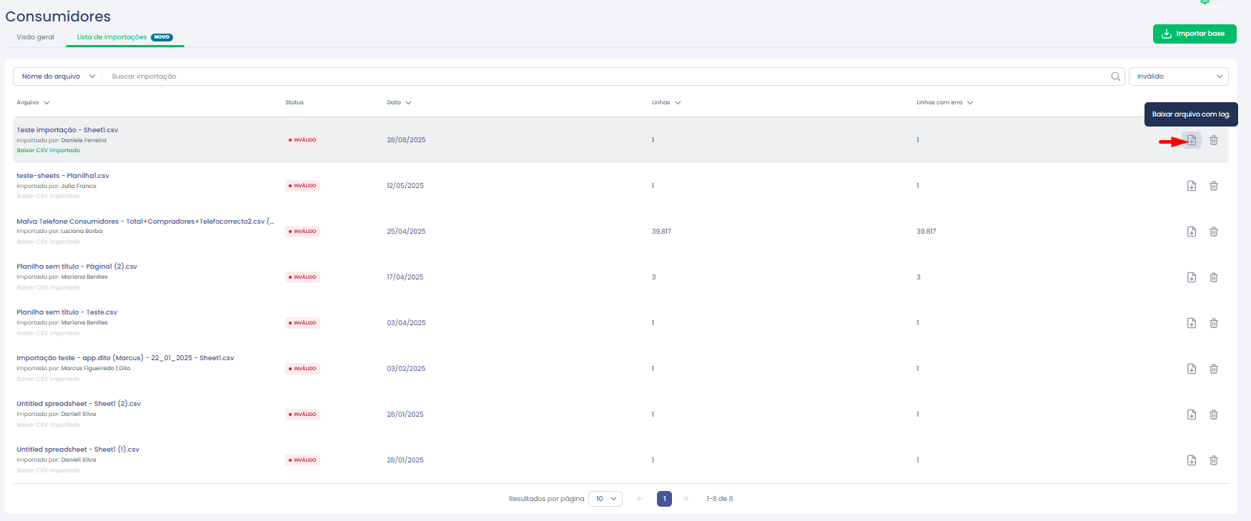 A Dito disponibiliza um log de verificação da base, onde você pode conferir quais linhas foram importadas corretamente e quais apresentaram alguma divergência. Para acessar, basta ir até a lista de importações e clicar em “Baixar arquivo com log”, conforme mostrado na imagem a seguir: