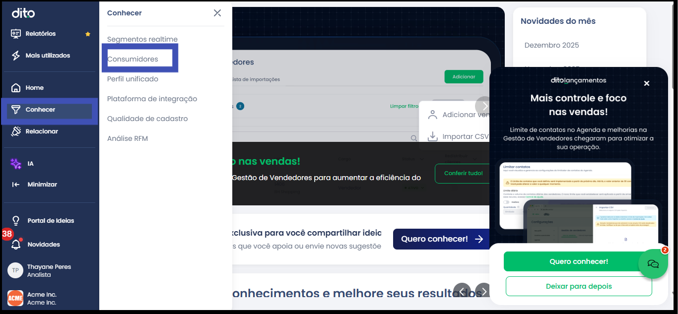Ao acessar o https://app.dito.com.br/ clique no Menu e em seguida, clique em consumidores: