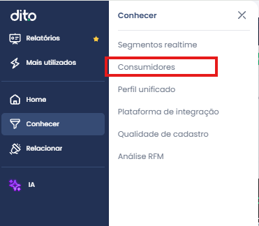 Você pode acessar o perfil do consumidor — onde a edição é realizada — pelo seguinte caminho: Menu “Conhecer” → “Consumidores”.