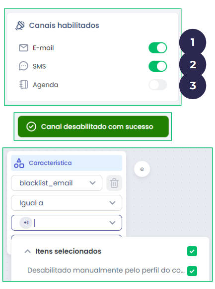Ao desabilitar será incluída uma característica de “blacklist_agenda” para o consumidor com valor “Desabilitado manualmente pelo perfil do consumidor”.