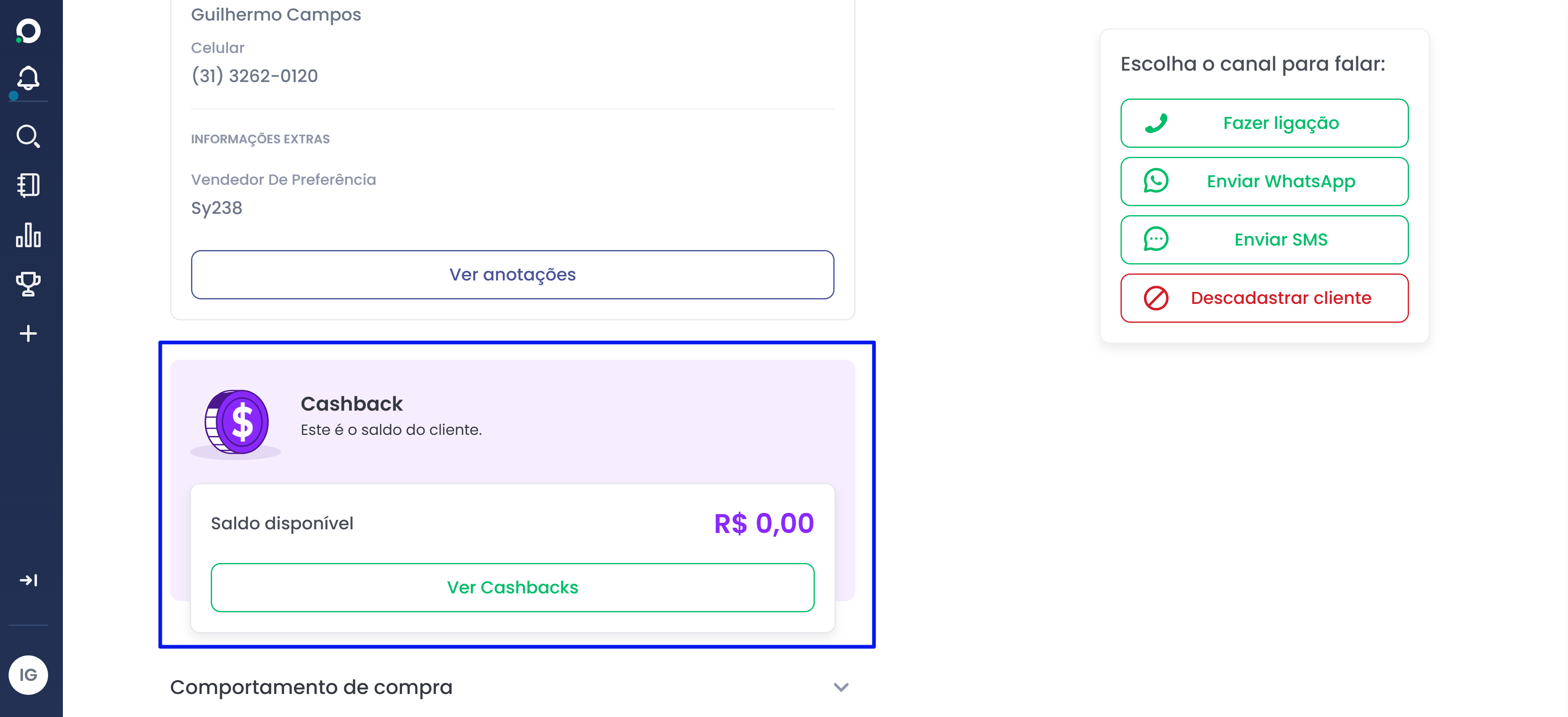 E ao clicar no perfil do cliente, será possível visualizar a calculadora de Cashback: