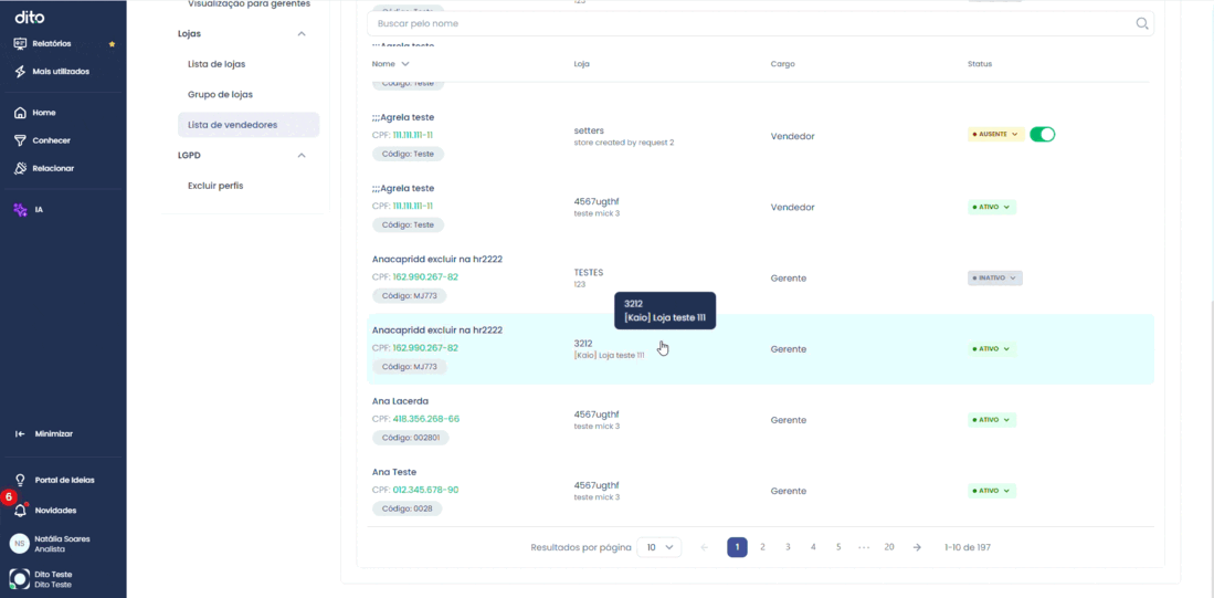 Acesse a ficha do gerente no app.dito, pela tela de Configurações > Lista de Vendedores.