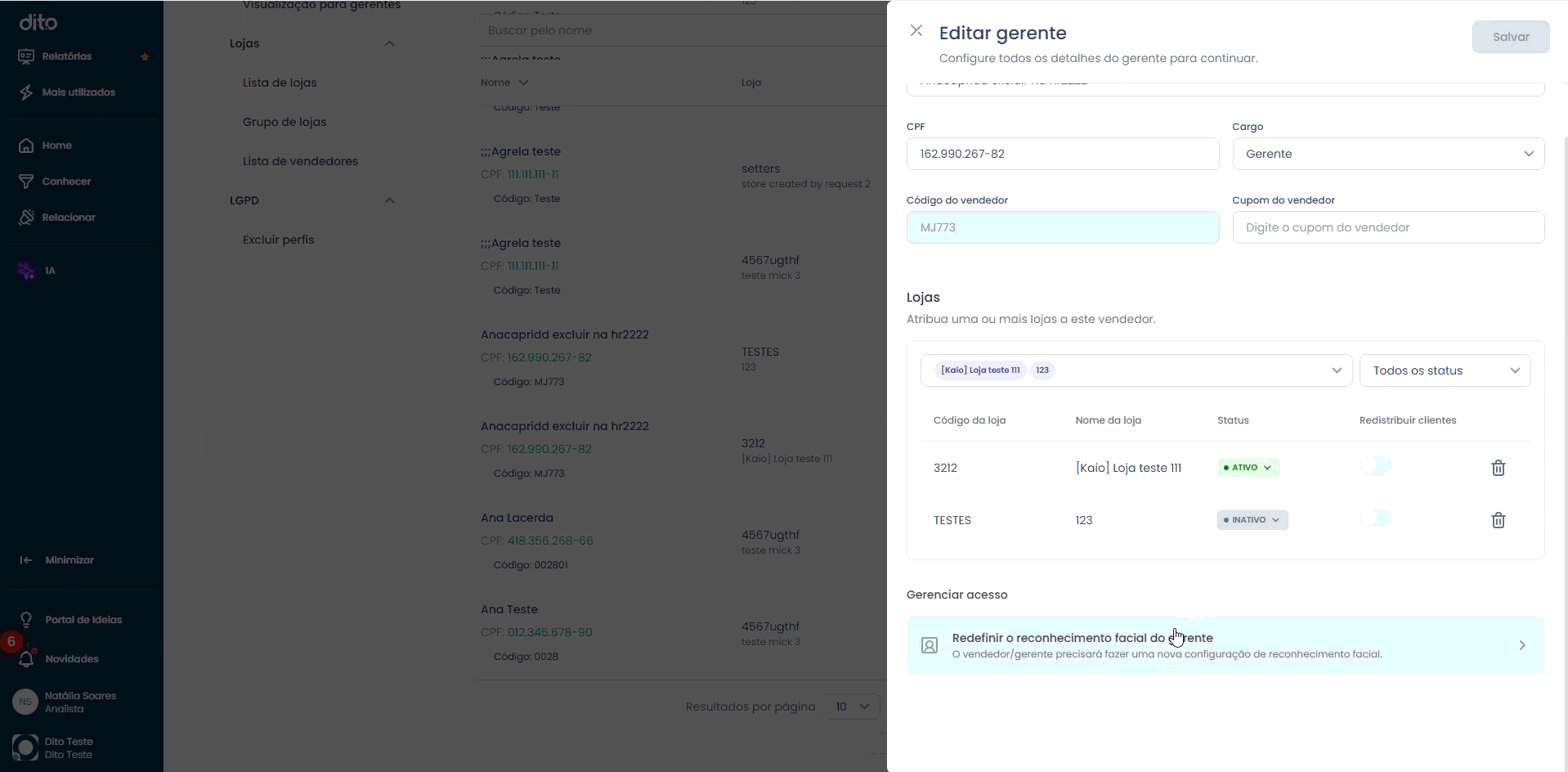 Se um gerente tiver problema para entrar com o reconhecimento facial, o reset do login é feito exclusivamente pelo responsável pelo CRM dentro do app.dito (gestão de usuários).