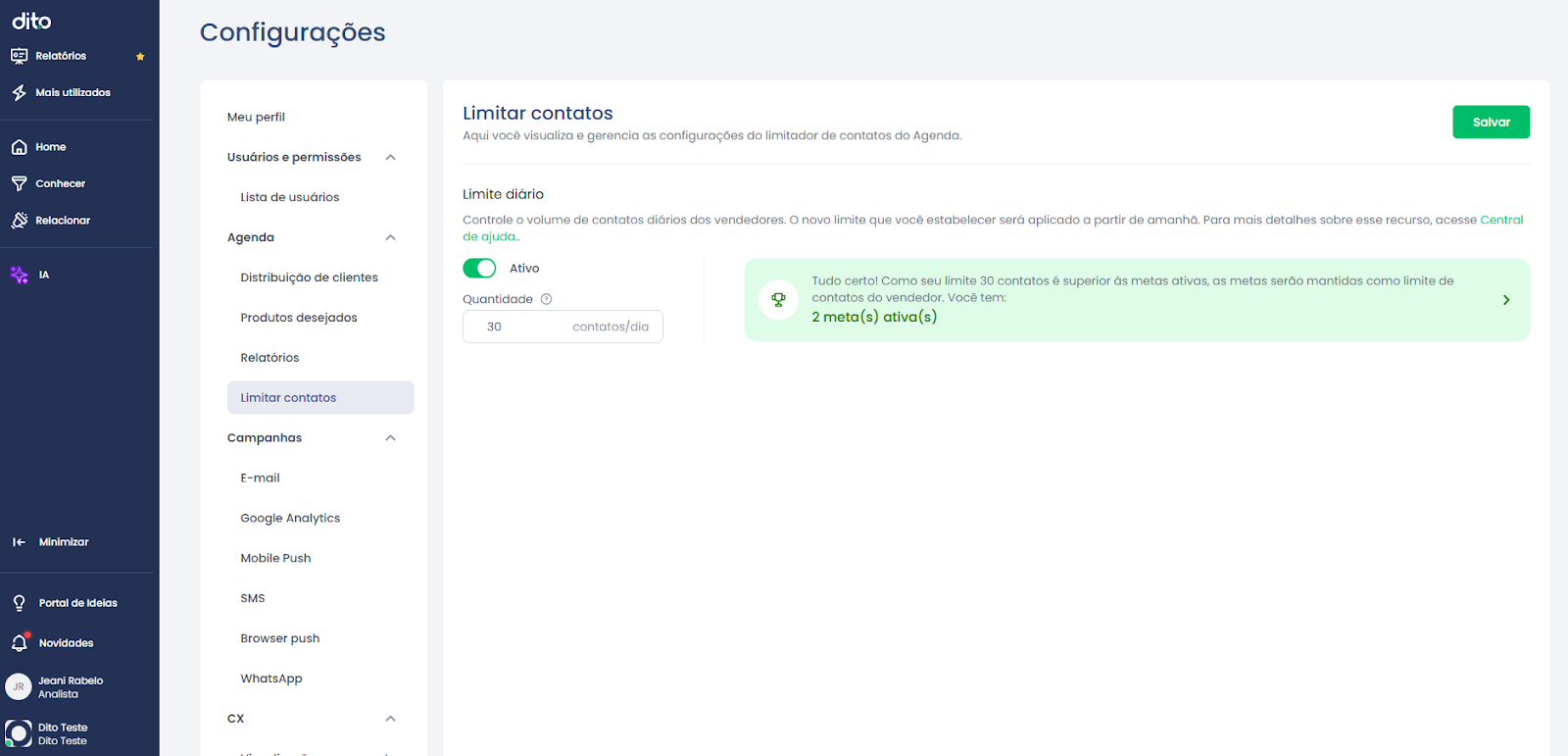 Imagine que a marca configure um limite de 30 contatos por dia por vendedor.
