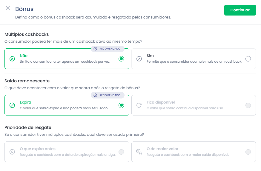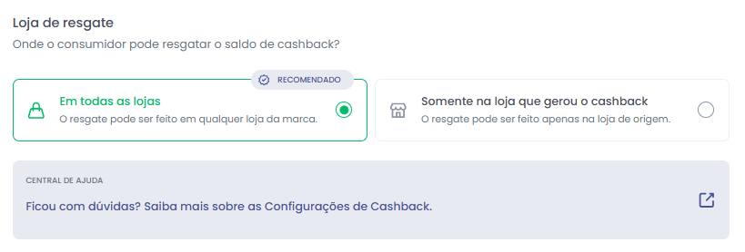 Essa opção fica disponível quando múltiplos cashbacks estão habilitados.