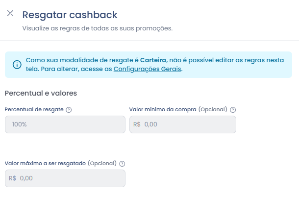 No modelo de carteira, a opção de resgate restrito à loja geradora fica indisponível, já que o saldo pode ser composto por créditos de múltiplas lojas.