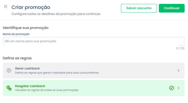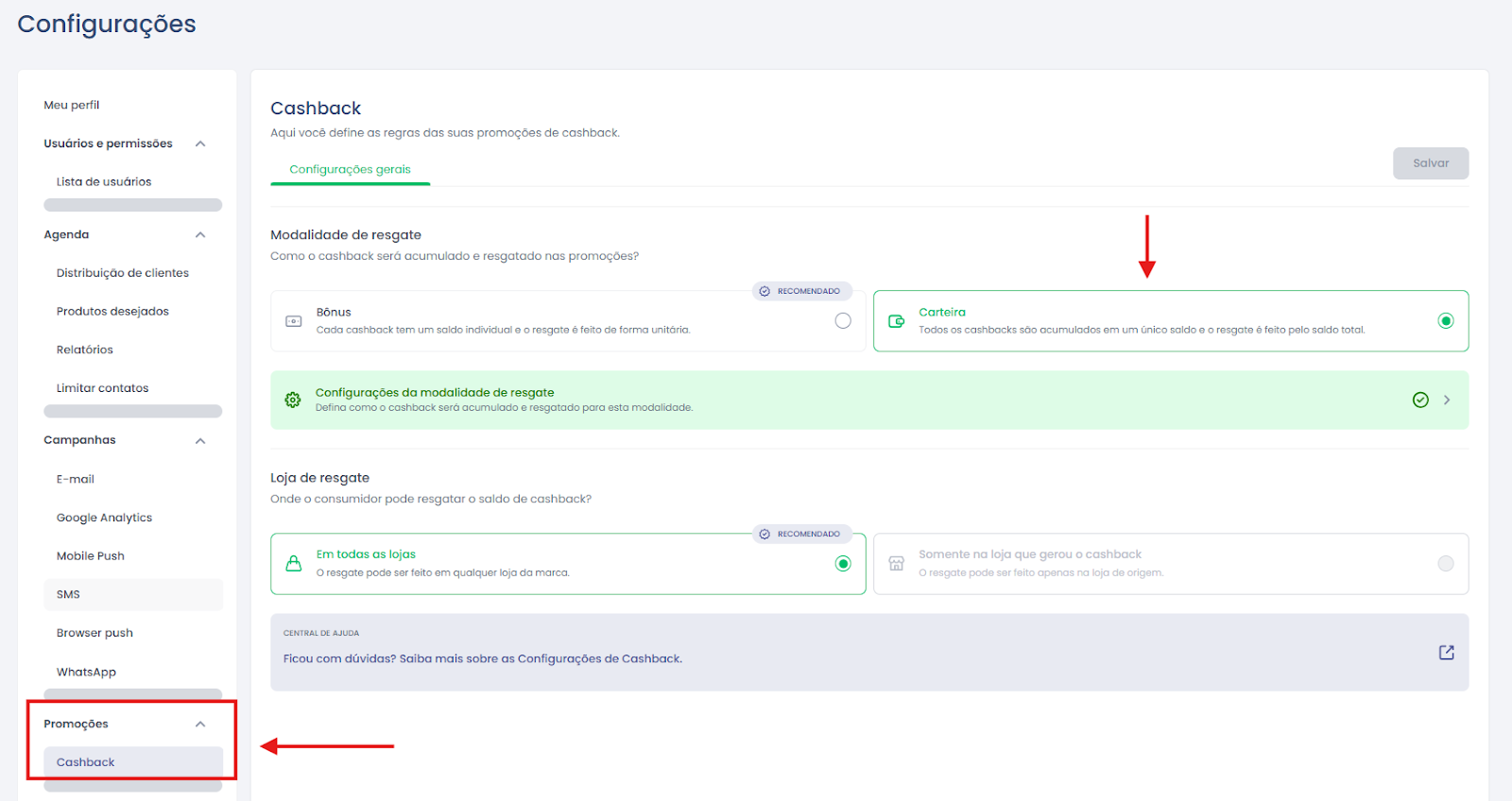 Ao adotar o saldo em carteira, as regras de resgate deixam de ser definidas por promoção e passam a ser configurações gerais da sua marca, aplicadas sobre o saldo total acumulado do cliente.
