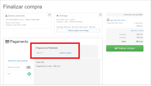 No checkout, deve-se exibir o valor de cashback disponível para uso do cliente.