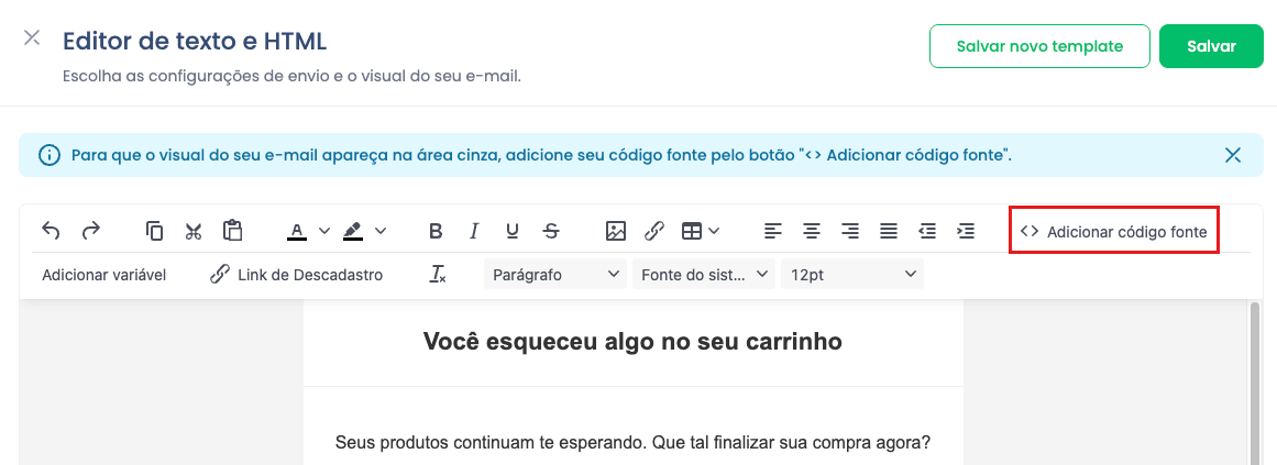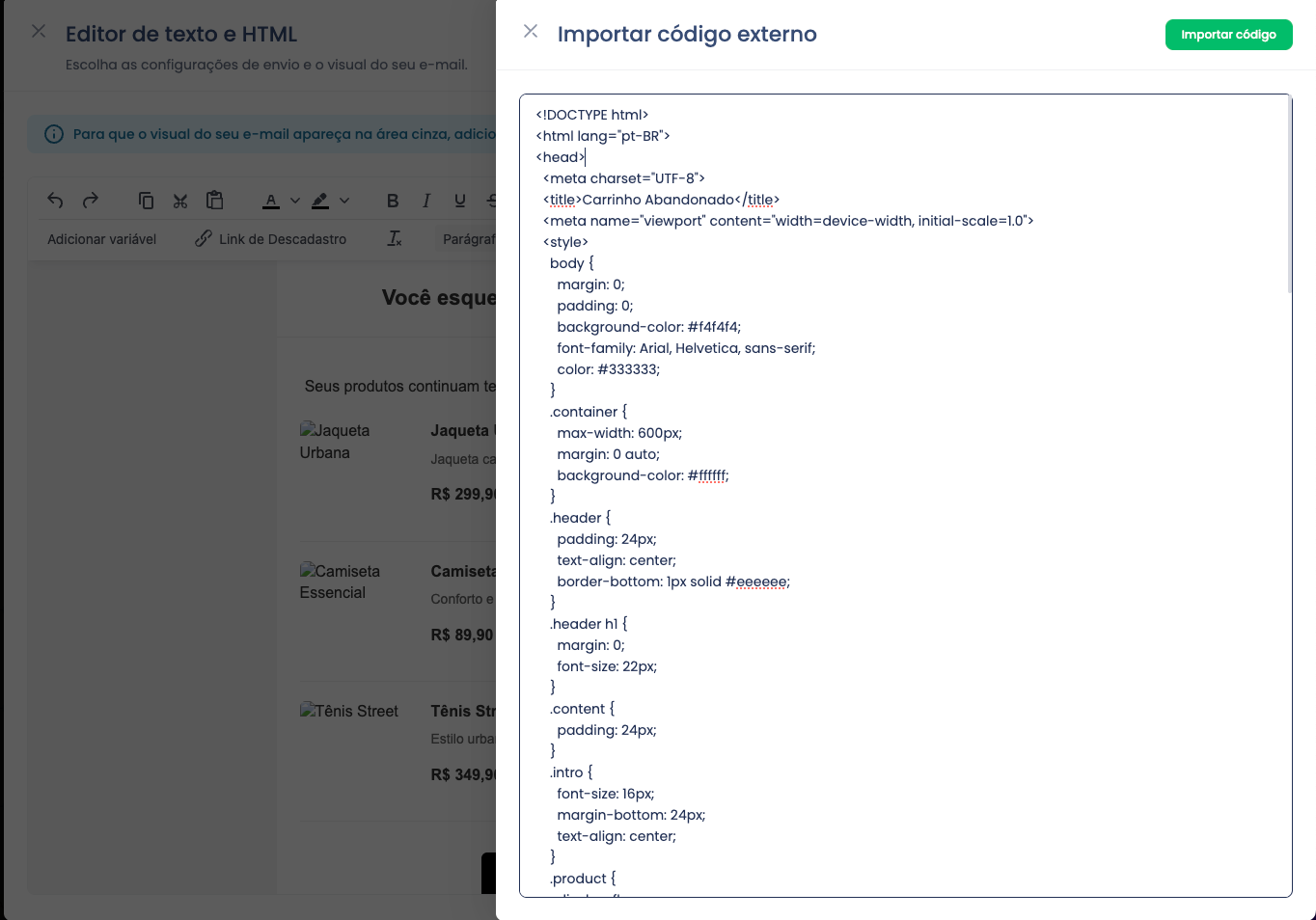 Cole o código copiado no bloco de HTML da Dito CRM. Você pode: