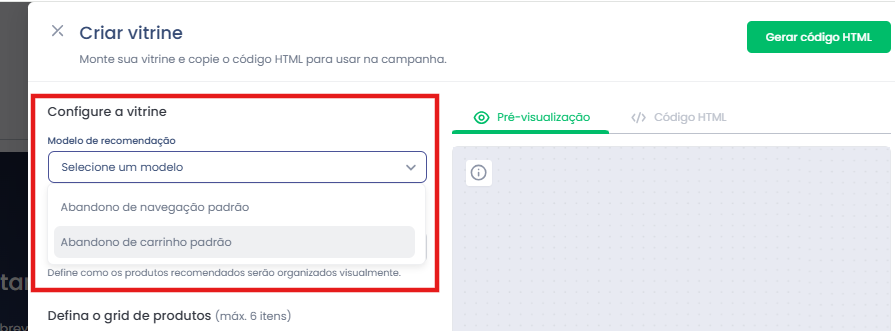 Clique no botão “Gerar Código HTML” para processar a sua vitrine. Isto irá desbloquear a sessão "Código HTML” que você poderá copiar o Código.