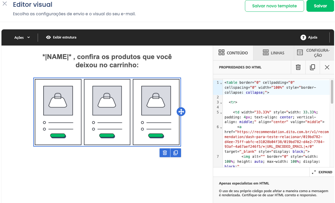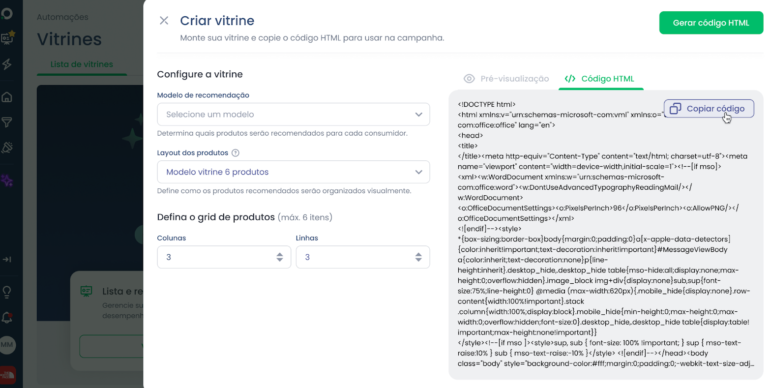 Nota: O código gerado não fica guardado no nosso banco de dados, por isso certifique-se de que o copia e utiliza no momento da criação.A criação de uma Vitrine de Produtos é uma estratégia poderosa para tornar seus e-mails mais relevantes, entregando o produto certo para o cliente certo de forma automatizada. Ao seguir este guia, você aprendeu a configurar desde a estratégia de recomendação até a inserção técnica do código HTML em seu editor. O resultado é uma comunicação visualmente atraente, dinâmica e focada em aumentar a conversão de suas campanhas de e-mail marketing.